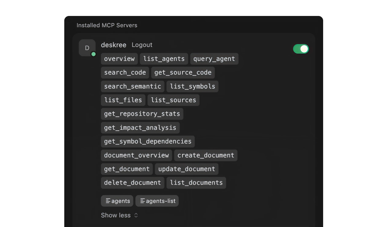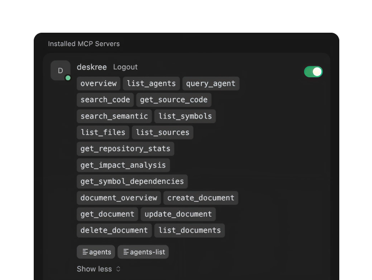 Connect your IDE directly to your knowledge map. Every retrieval path, every agent, every indexed source is accessible without leaving your editor.