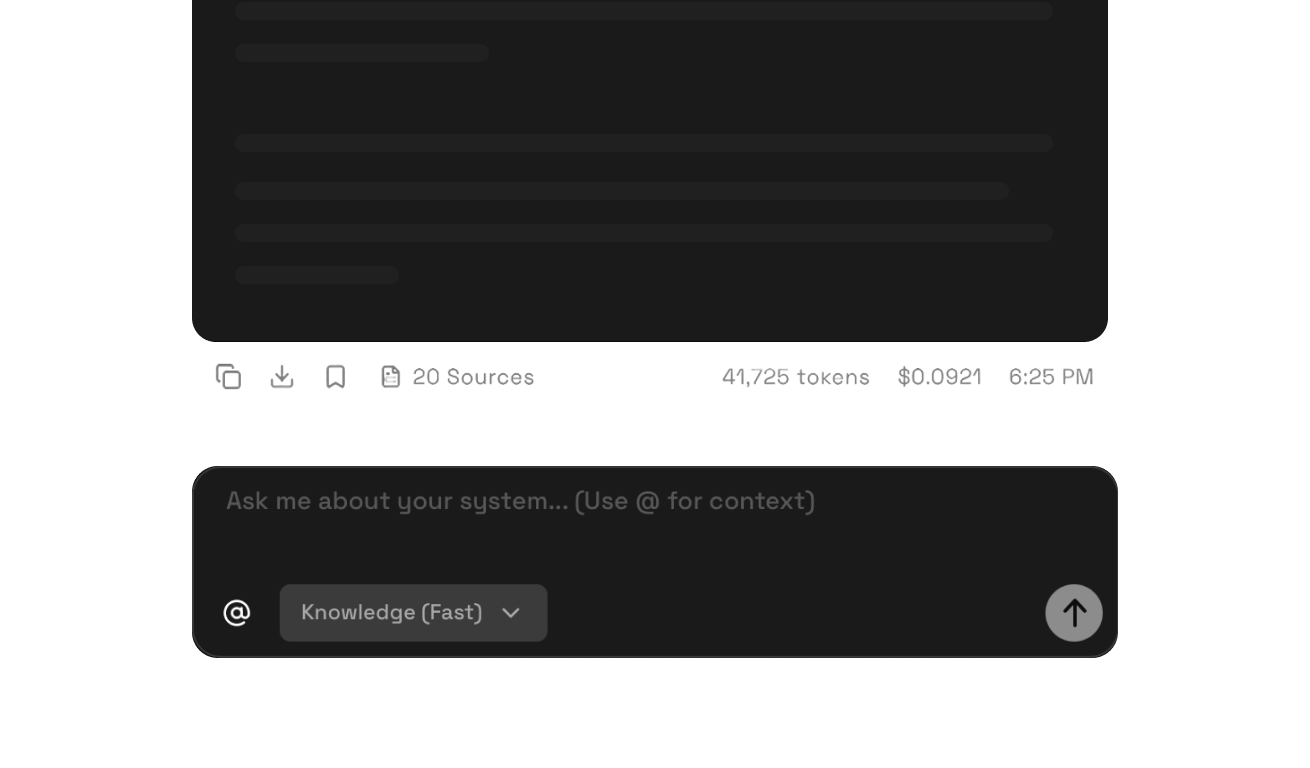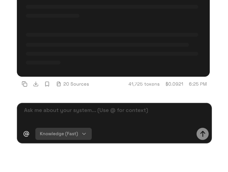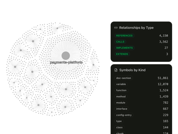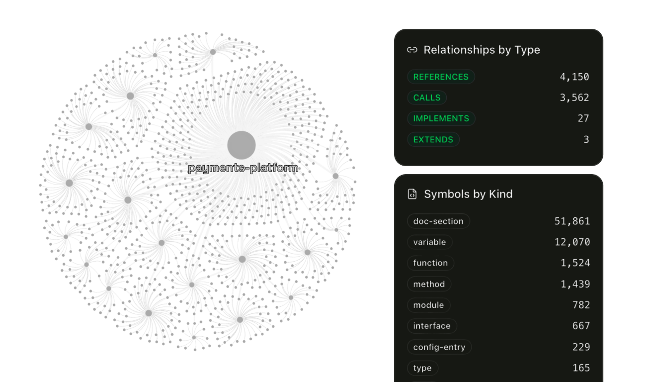 Your IDE gets structured knowledge: symbol relationships pre-computed at index time, cross-repository dependency chains already resolved, architecture standards and engineering docs indexed alongside code. Your LLM isn't reconstructing your system from whatever files are in the buffer. It's querying structure that already exists.